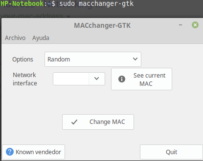 To run macchanger in GUI mode use the command: $sudo apt-get install macchanger-gtk macchanger-gtk.